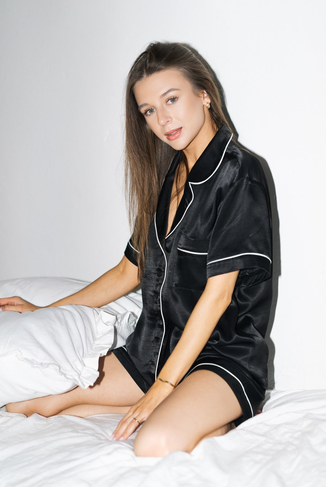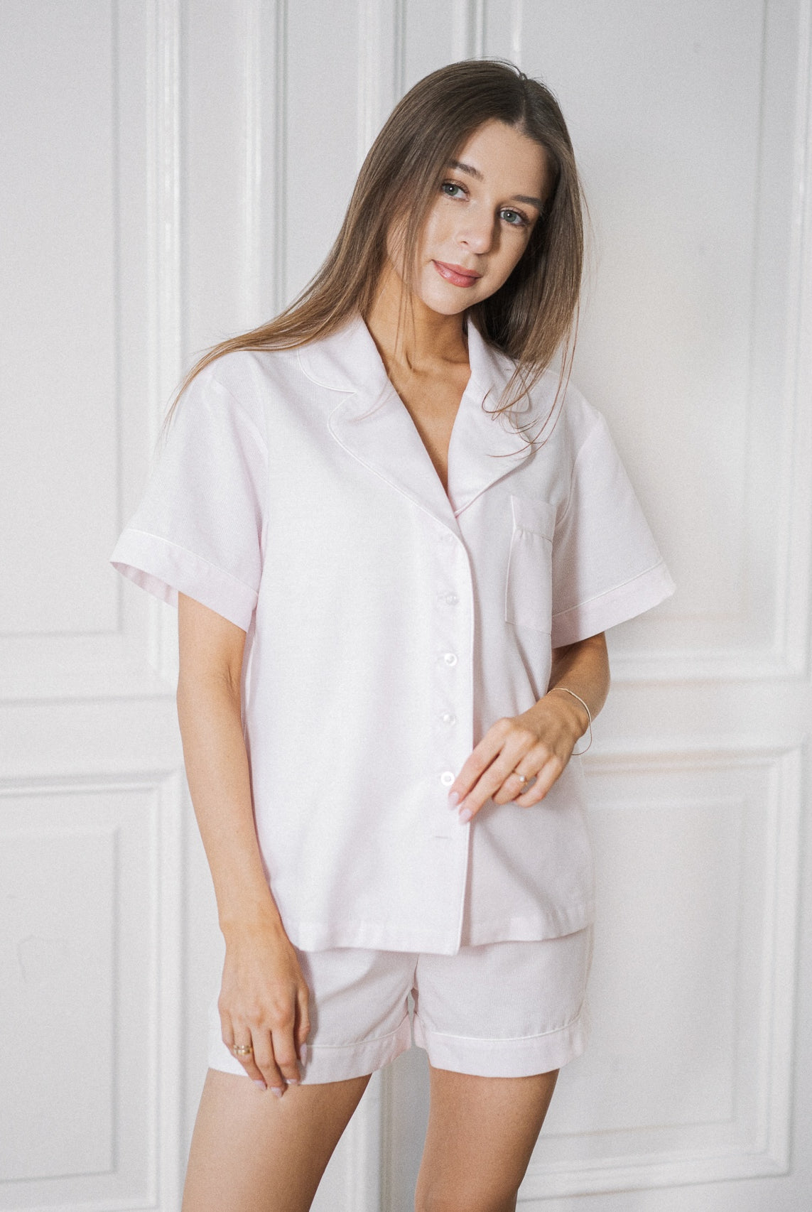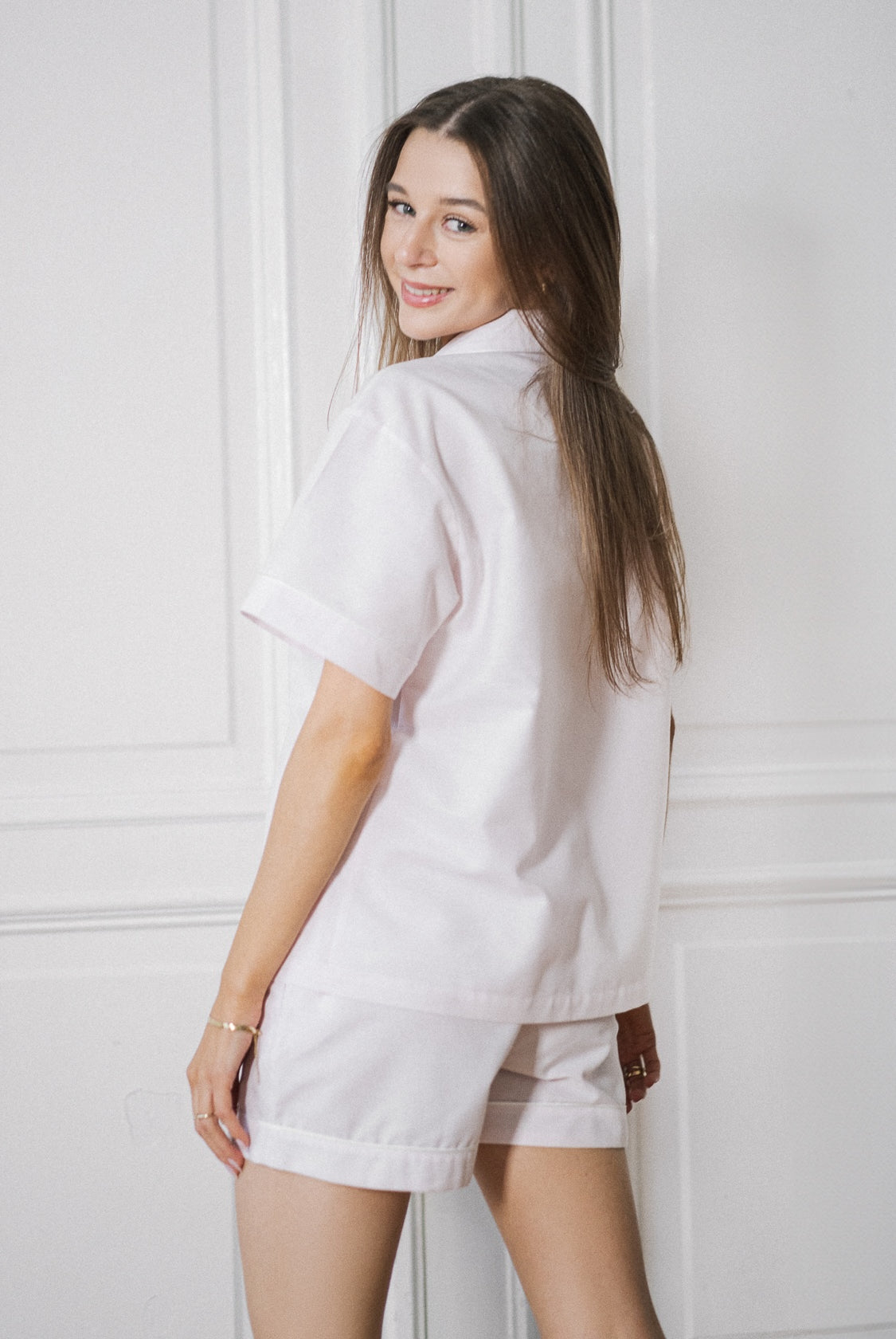 Na stanie dostępne są piżamy petite w wersji czarnej lub różowej, które są czymś więcej niż typową piżamą – to domowy komplet, który równie dobrze wygląda z herbatą w ręku, jak i w szybkim wyjściu na balkon. Krój oversize, ale dopasowany do sylwetki petite, sprawia, że materiał się nie ciągnie, a rękawy nie zakrywają dłoni. Długość spodenek też jest przemyślana – wygodna, ale nie przypadkowa. Wszystko wygląda naturalnie i dobrze – bez potrzeby kombinowania z proporcjami.