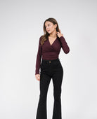 Elastyczna dzianina, zakładany przód, dopasowuje się do sylwetki, odpowiednia również na większy biust, marszczenia po bokach, kobiecy krój, wygodna i uniwersalna.