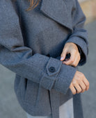 Dwurzędowy fason, zapinany na guziki, wiązany paskiem w talii, 100% wełna merino, podszewka, klasyczny krój, ciepły i elegancki