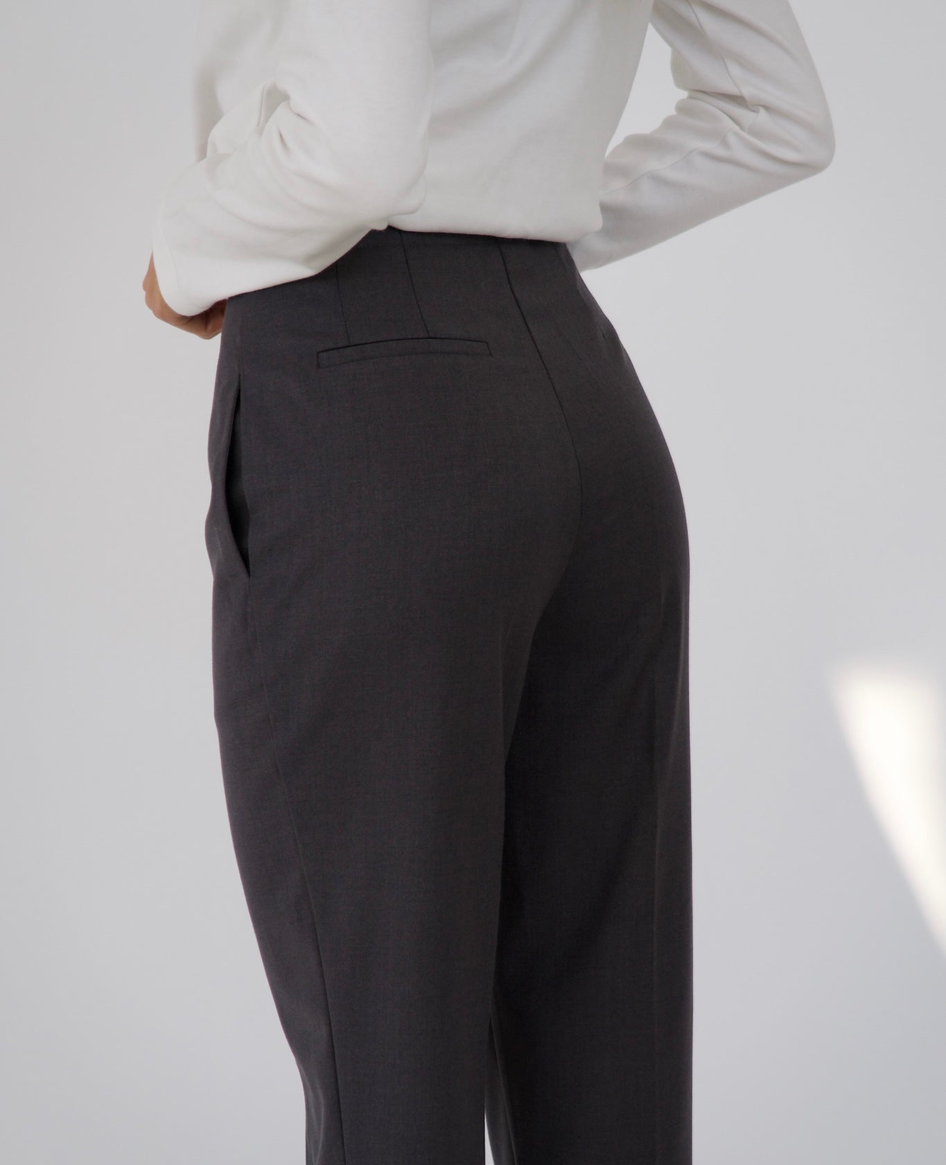 Wysoki stan, dopasowany krój, zwężane nogawki, ozdobne przeszycie z przodu, kant z tyłu, kieszenie w bocznym szwie, atrapa kieszeni z tyłu, gładko wykończona góra, zapięcie na haczyk, elastyczna guma z regulacją w talii