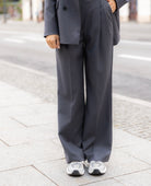 Szerokie nogawki w kant, zakładki z przodu, dwie kieszenie po bokach, regulacja talii, dzięki specjalnej gumie.