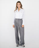 Szerokie nogawki w kant, zakładki z przodu, dwie kieszenie po bokach, regulacja talii, dzięki specjalnej gumie.