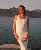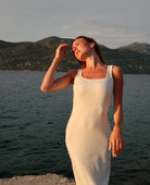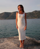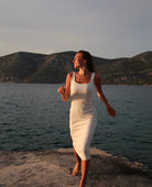 Długość midi, kwadratowy dekolt z przodu oraz z tyłu, szerokie ramiączka.