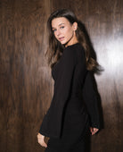 elastyczna dzianina, marszczenia po bokach na gumkach, możliwość regulacji długości, można nosić w wersji krótszej lub dłuższej, poszerzane rękawy, kobiecy i wygodny krój.